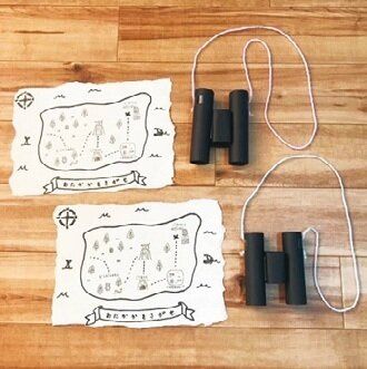 手描きの地図は端をビリビリ破り、コーヒーで染めてレトロ調に加工。双眼鏡は黒いテープを巻いたトイレットペーパーのしんで手作り。