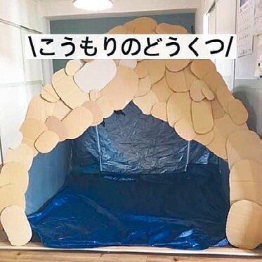 アニメ映画を見た長男が「冒険したい」と言ったので、家全体を使って探検ごっこを実施!洞窟に見立てたテントの入り口にはカットした段ボールを貼りつけ。