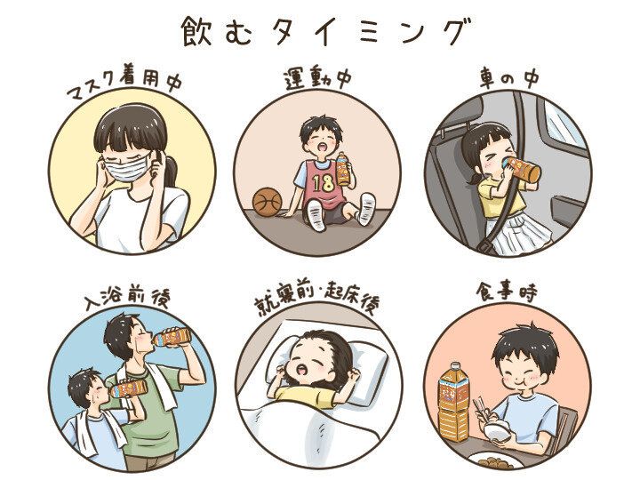 しかし、水分・ミネラル補給は、のどの渇きを感じたときには遅く、一度にたくさん飲んでも、体にうまく吸収されず、尿などで排出されてしまうため、こまめに飲む「点滴飲み」で効果的に水分・ミネラル補給しましょう! 1時間にコップ1杯程度(100~200ml)が目安です。点滴飲みを意識してお子さんには「のどがかわく前に水分・ミネラル補給をさせるように」心がけてください。