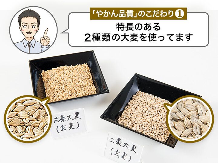 一般的な麦茶といえば、六条大麦を使用していますが、健康ミネラルむぎ茶では、「六条大麦」に加え、「二条大麦」も使用しています。六条大麦はたんぱく質を多く含むため、焙煎すると香ばしさが増すのが特長です。一方、二条大麦はでんぷんの比率が高く、加熱すると糖化することで甘くなるのが特長です。六条大麦の香りと二条大麦の甘み。特長の違う2種類の大麦をブレンドすることで、健康ミネラルむぎ茶の味わいが生まれているんです。