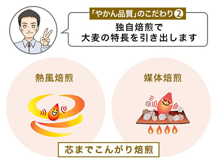 やかん品質のこだわりは原料だけではありません。焙煎工程にも伊藤園ならではの工夫があります。一般的な麦茶は、「熱風焙煎」(ねっぷうばいせん)を採用していますが、健康ミネラルむぎ茶では、熱風焙煎(ねっぷうばいせん)に「媒体焙煎」(ばいたいばいせん)を組み合わせた「芯までこんがり焙煎」を採用しています。
