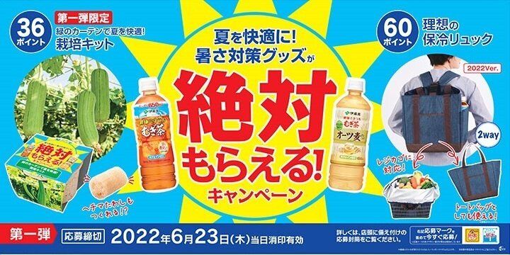 夏を快適に過ごす!“暑さ対策グッズ”が絶対もらえるキャンペーン実施中。2Way仕様の「理想の保冷リュック」や第一弾限定の「緑のカーテン栽培キット」など、夏を快適に!楽しく過ごせる景品がいろいろ。キャンペーン第一弾は5月9日(月)~6月23日(木)当日消印まで!