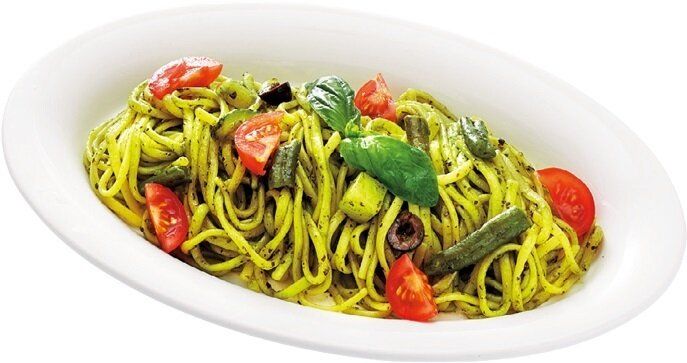 麺はリングイーネを使用。「香り豊かなバジルとチーズが、たまらない!黒オリーブやズッキーニなど、具材もたっぷり」(西)