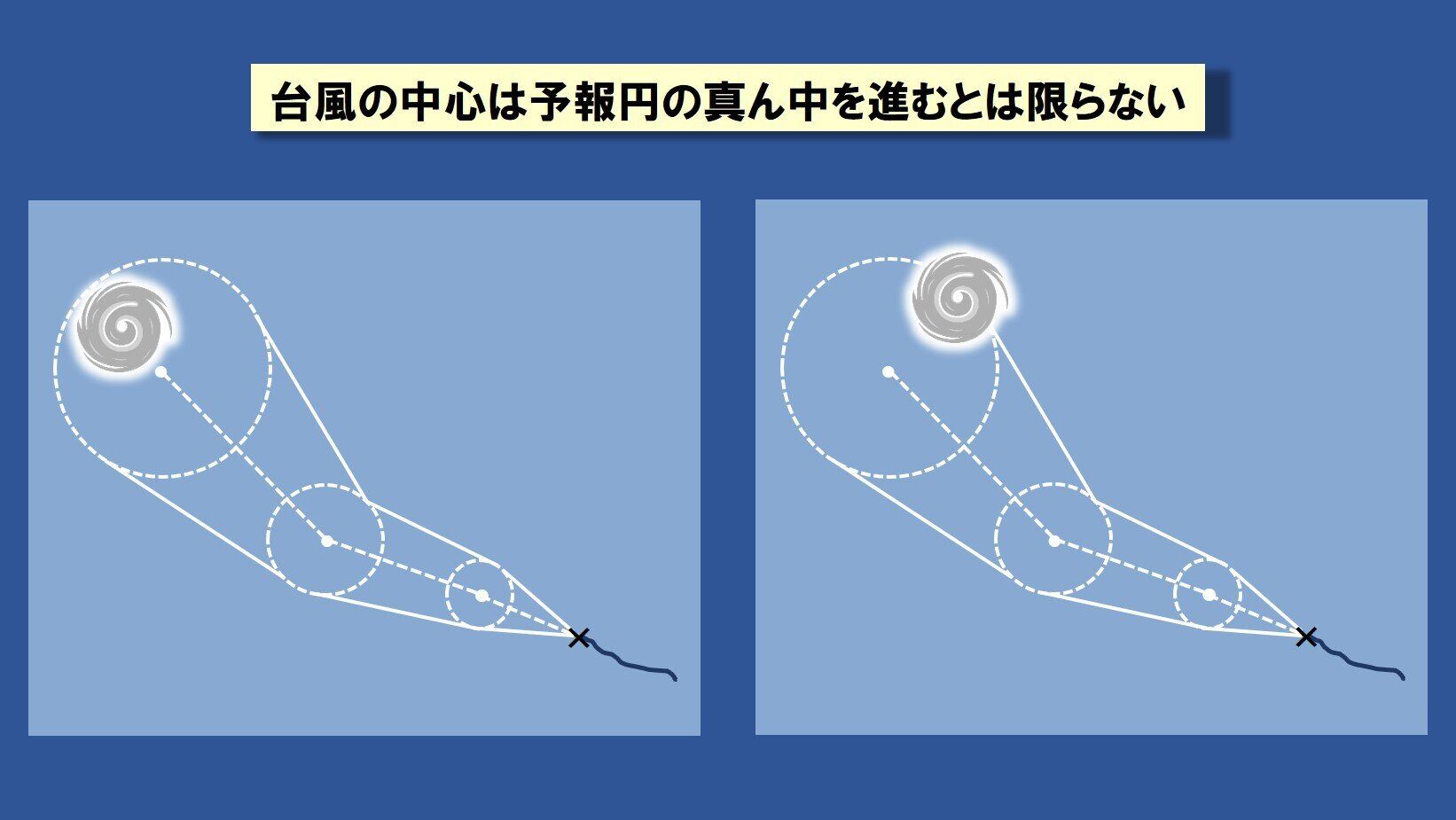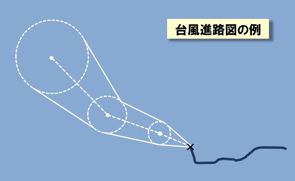 あくまで台風の「中心」が予報円の中のどこかへ進む、というだけの話ですから、もし台風の中心が円の端っこのほうへ進んだ場合、予報円の外でも台風本体による暴風や豪雨に見舞われることになります。