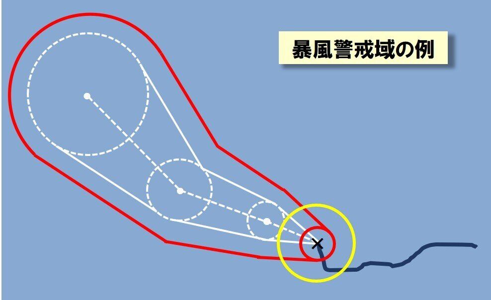 白い円で示された予報円、赤い線で示された暴風警戒域。なお台風の現在地は×印で示されることが多く、その周りの黄色い円は現在の強風域(風速15m以上)、赤い円は現在の暴風域(風速25m以上)。