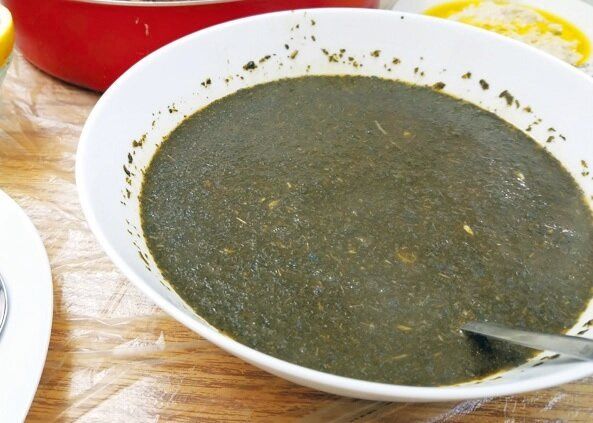 深緑一色。チキンの出汁ににんにくが効いたモロヘイヤのスープは、ヨルダン定番の家庭料理。1品ド~ンと大皿で出し、各自ごはんにかけて食べる。見た目は地味だけど愛されているのは本当においしいから。