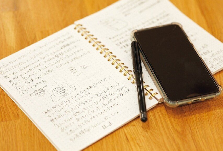探検に欠かせないノートとスマホ。ノートには習ったレシピに加え、地理や気候のことなども細かくメモ。
