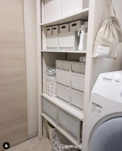 無印良品のポリプロピレンケースはあらゆる場所で使うことができます。こちらは脱衣所の収納に活用している例です。すべて白で統一され、おしゃれで素敵ですね。