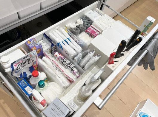 ごちゃごちゃしてしまいがちなシンク下も、無印良品のファイルボックスを使えばきれいに整頓できますね。いろいろな大きさを組み合わせれば、ぴったりフィット!見やすく、取り出しやすい収納ですね。