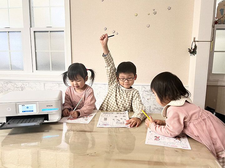 「プリンターは普段から、子どものドリルや塗り絵、お誕生日や季節のイベントの飾りなどでプリントアウトしているため使用頻度が高いのです。子どもたちにとっては、「プリント=楽しい」と刷り込まれているせいか、プリンターが動き出すと、いつもワクワクしながら集まってきます。