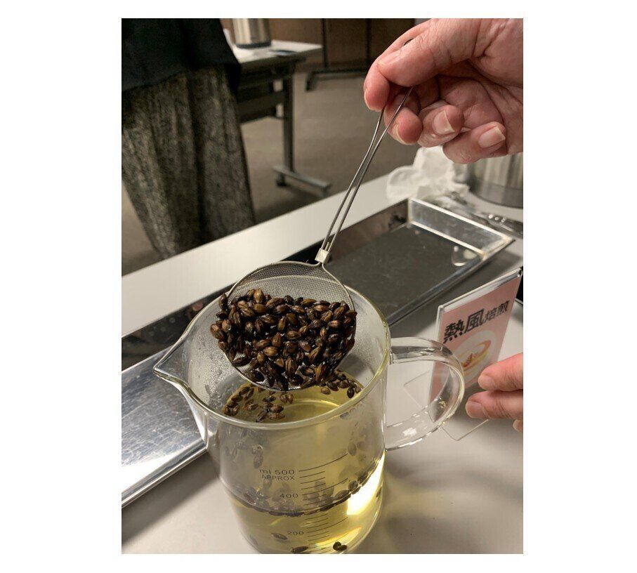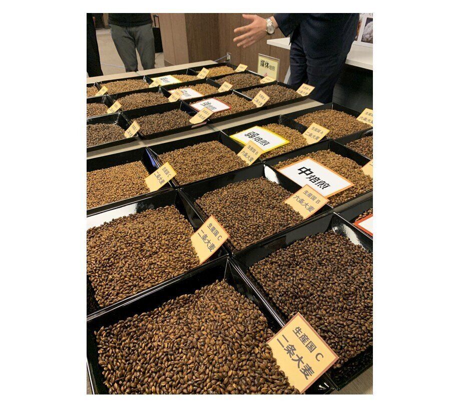 写真は、原料である六条大麦、二条大麦の一部。それぞれ焙煎方法の強弱を変えてから抽出したものを、幾度となくテイスティングを重ねてベストな割合を作り出していくのだそう。
