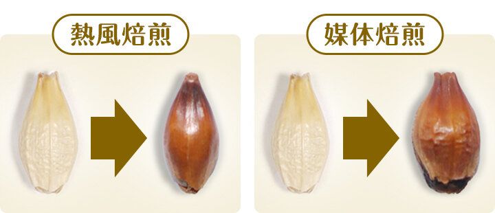 熱風焙煎した大麦はシュッとしているのに対して、媒体焙煎した大麦はふっくらと膨らんでいる。