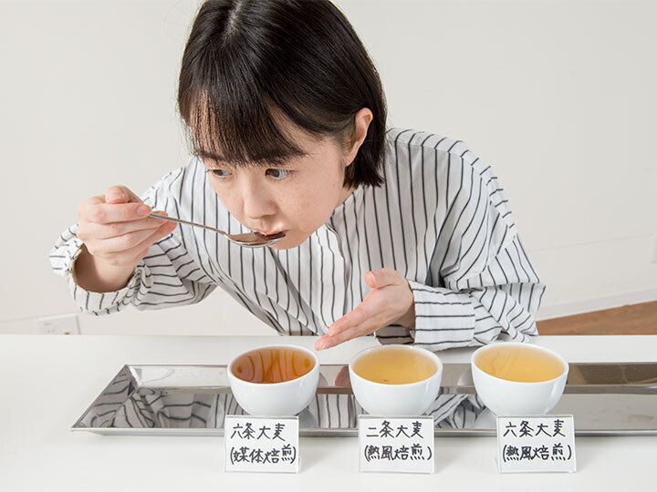 「六条大麦を媒体焙煎すると麦粒の中がスポンジ状になります。そこにお湯が入るので、しっかりと抽出され、濃度感のある味わいを引き出すことができるのです。検茶は開発の第一歩で、私たちは常に、最適なバランスを探しているんですよ」