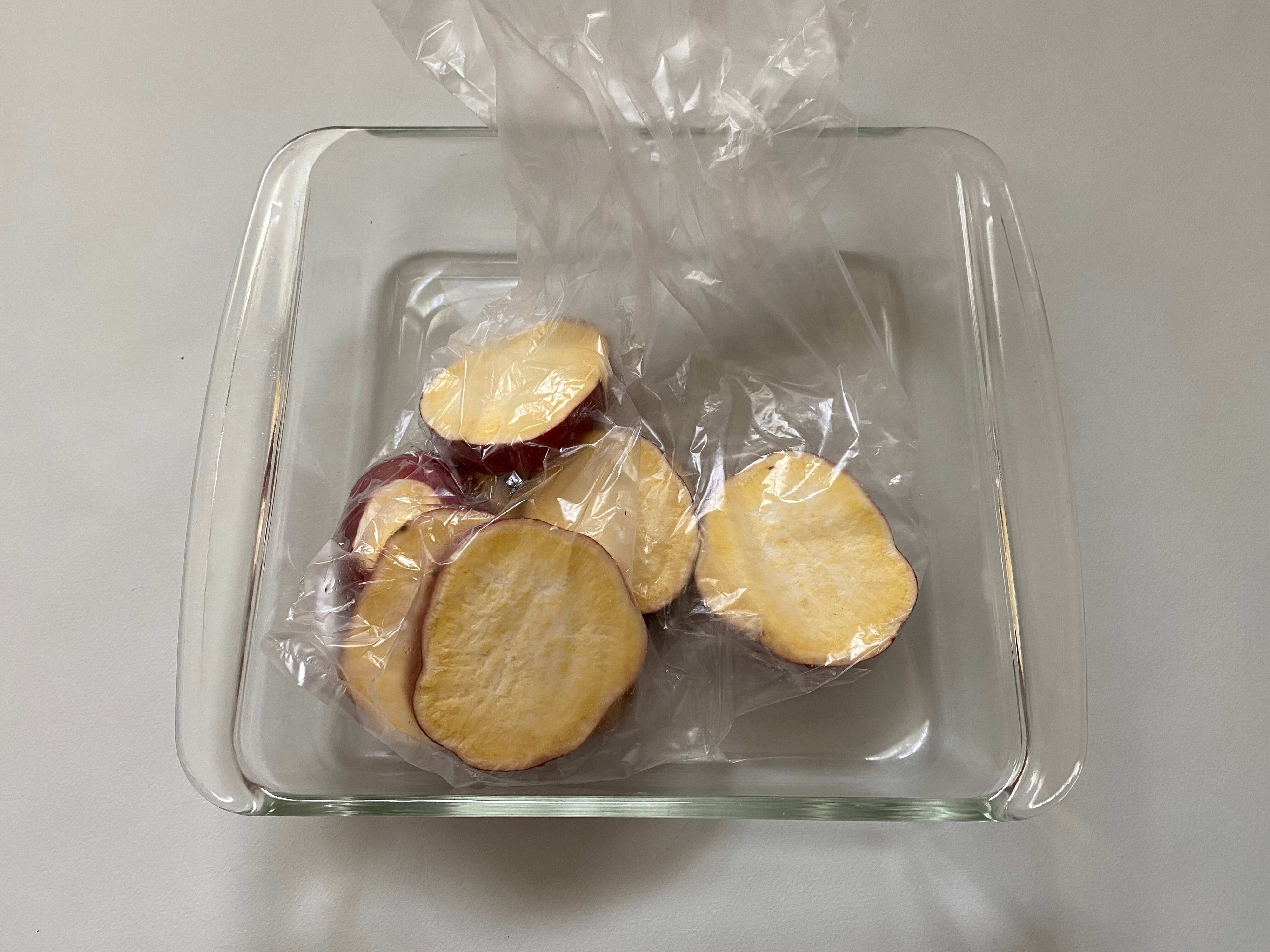 電子レンジOKということで、ラップにさつまいもを入れ、袋は縛らずにクルっとまきつけてチンしました!