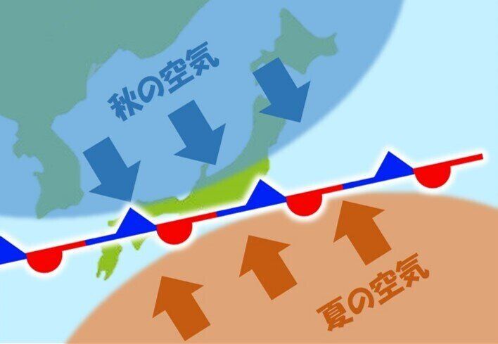 北から秋の空気がやって来ようとするのに対して、まだまだ夏の空気が居座ろうとするので、性質の異なる2つの空気が押し合いになります。