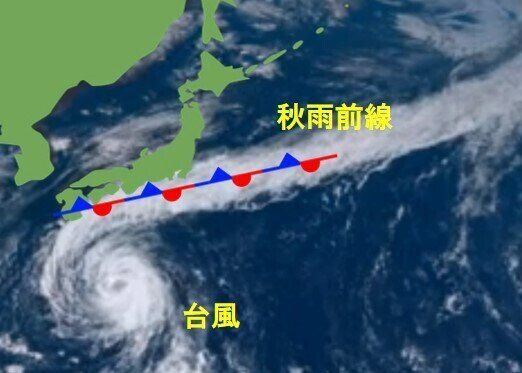 つまり、日本列島に梅雨前線がかかっている状態で台風がやって来ることによって大雨になるケースです。