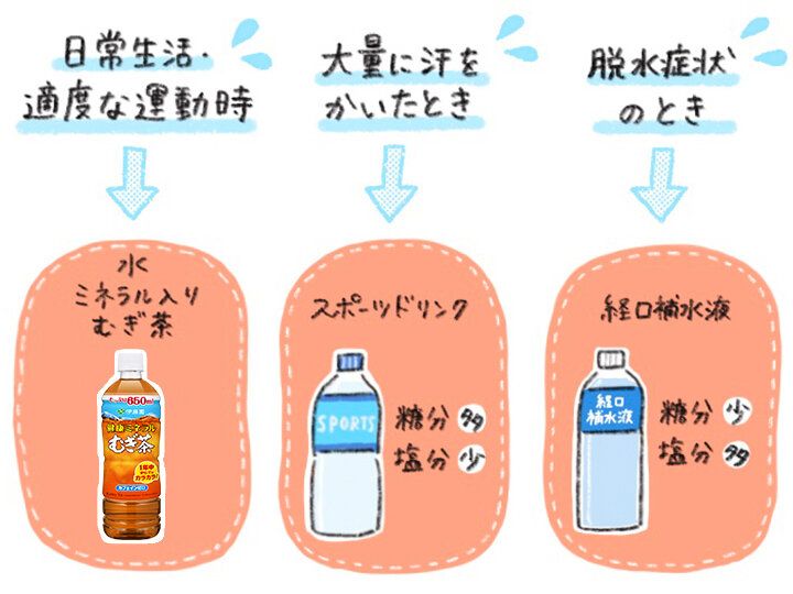 毎日の生活の中で水分&ミネラル補給に最適なのはミネラル入りむぎ茶ですが、体調や生活シーン別に飲料を飲み分けることも大切です。