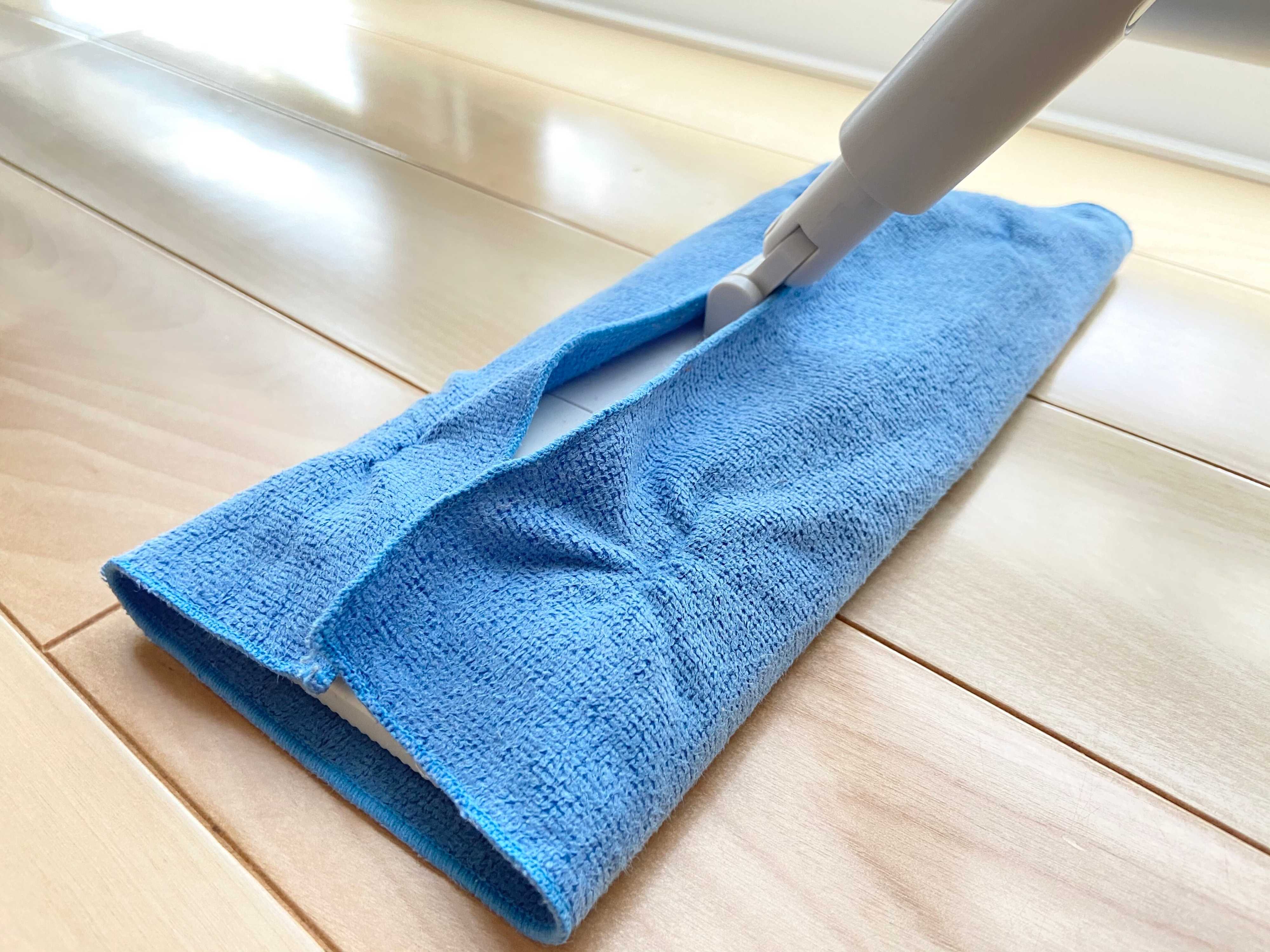 一般的なクロスに比べると少し小ぶりで、手で拭いて使うのにもちょうど良いサイズ感なのですが、お家にあるフローリングワイパーにサイズがぴったりで付属品かのように使えます。その日の気分で座ってと立っての掃除を選べるのも嬉しい点です。