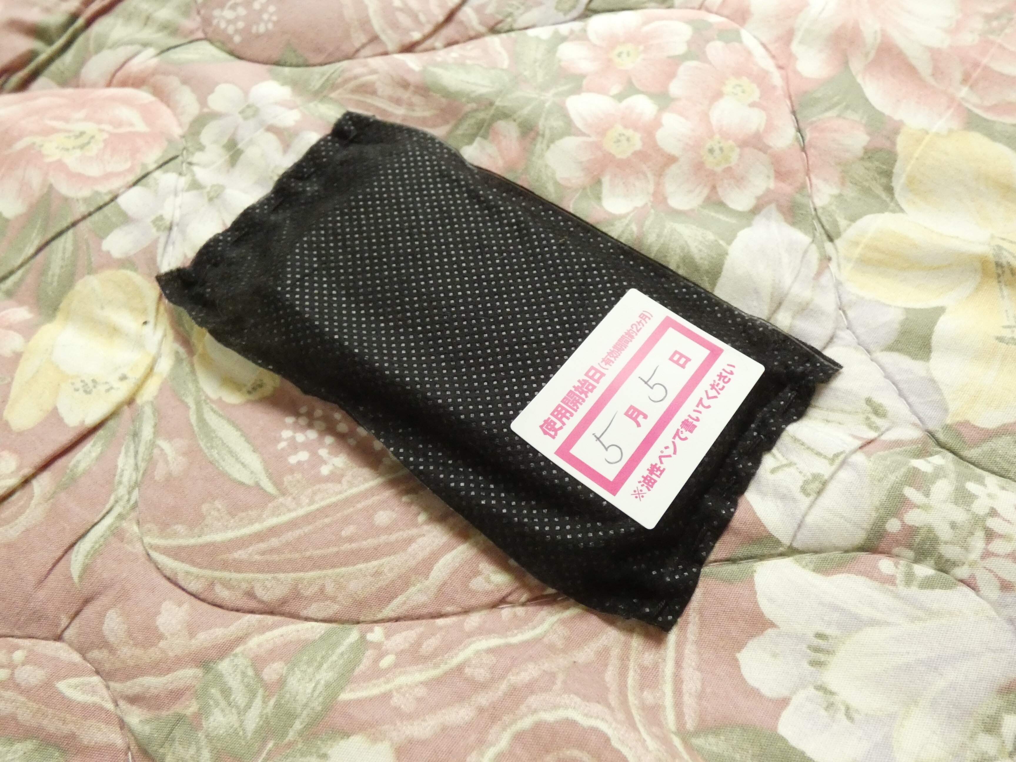 我が家はベッドではなく布団を敷いて寝るので、取れないように両端を縫い付けて有効期限シールをつけました。