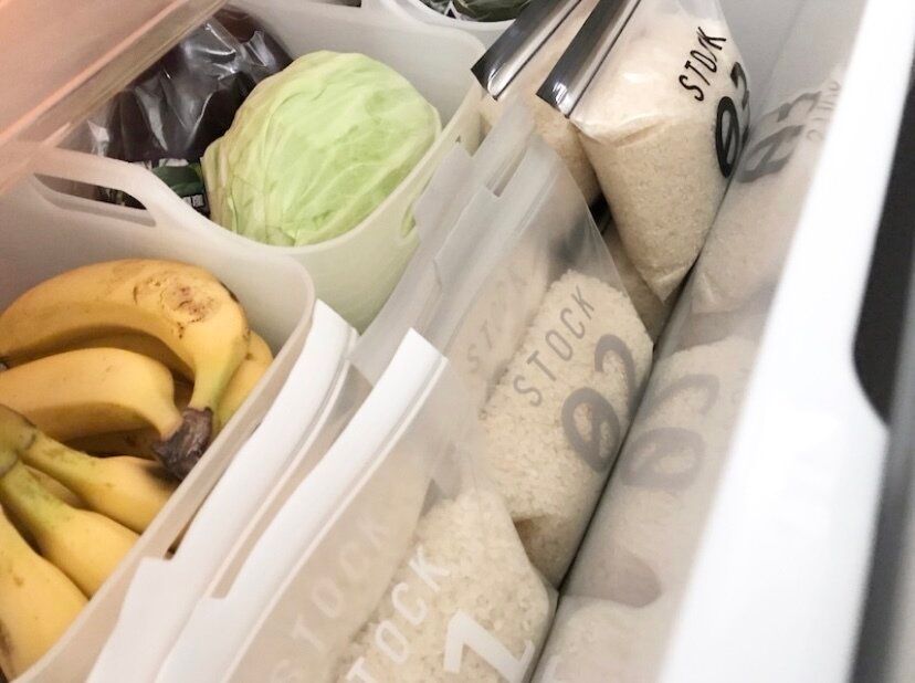 お米はちょうど冷蔵庫の野菜室に収まる無洗米5kgで購入することに決めており、家族がぴったり食べ終わる量のお米(現在は2.5合とお弁当やカレー・オムライスや丼モノ用に3合)をジップロックに小分けにして保管することにしています。