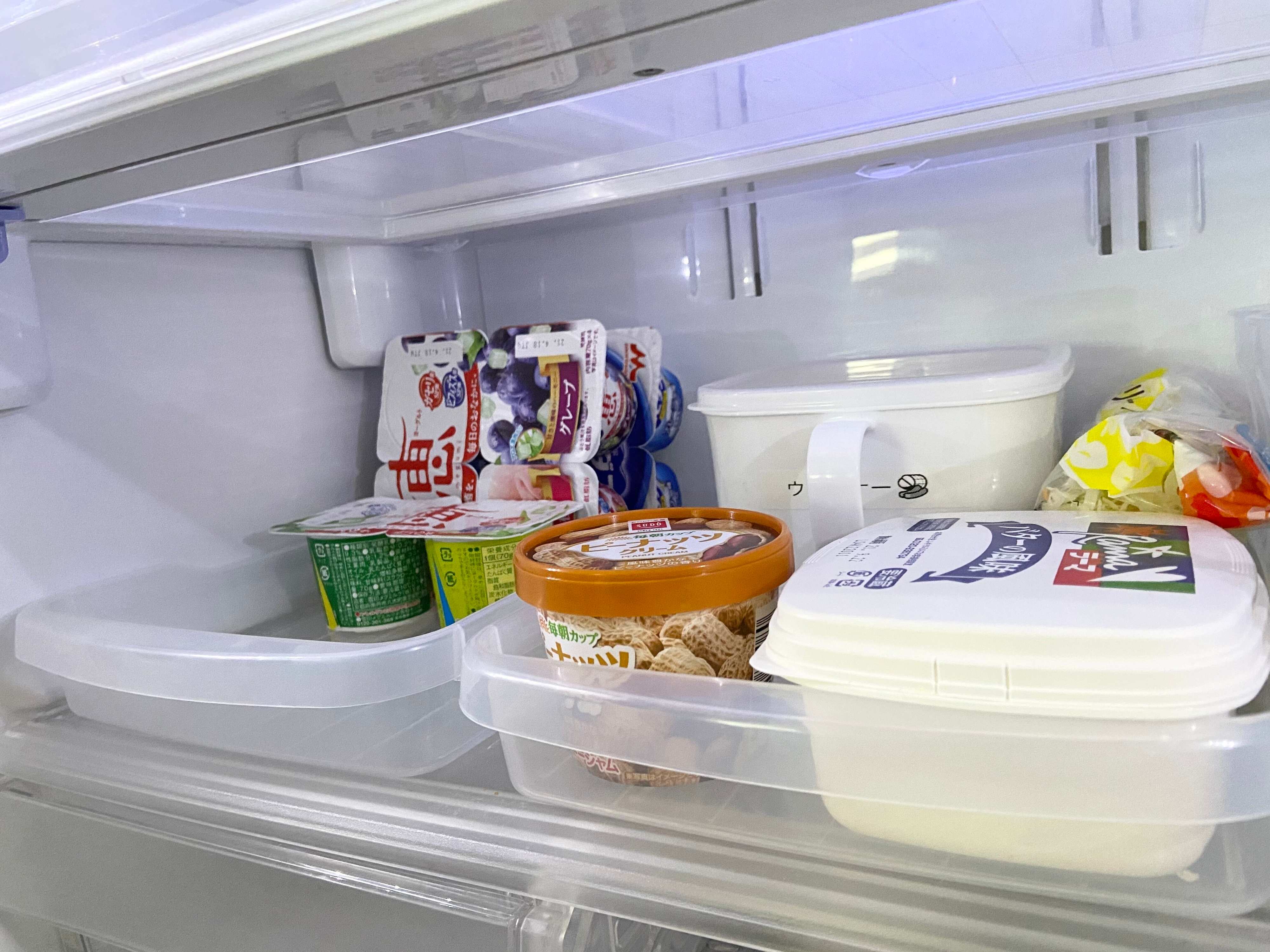 夜ご飯は毎日メニューが違いますが、朝ご飯はパンの種類が変わるくらいでほとんど内容はいっしょ。そのためまとめて取り出せるように朝ご飯ルーティンセットは一番手が届きやすい冷蔵庫の下段にセットします。トレーごと取り出して終わったら戻すとようにしておけば冷蔵庫を開け閉めする回数もグンと減りますし、面倒もありません。
