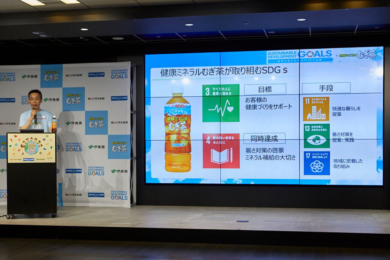 商品製造時に出る緑茶の茶殻やむぎ茶のむぎ殻を有効的に再利用していること、2030年度にペットボトルを100%リサイクル素材等にすること、そして、日本国内で歴代最高気温を記録した5つの都市(浜松市、熊谷市、四万十市、多治見市、山形市)で結成される「一般社団法人アツいまち」とともに、グリーンカーテン事業など、暑い街を住みやすくする活動を行っているなどの発表がなされました。