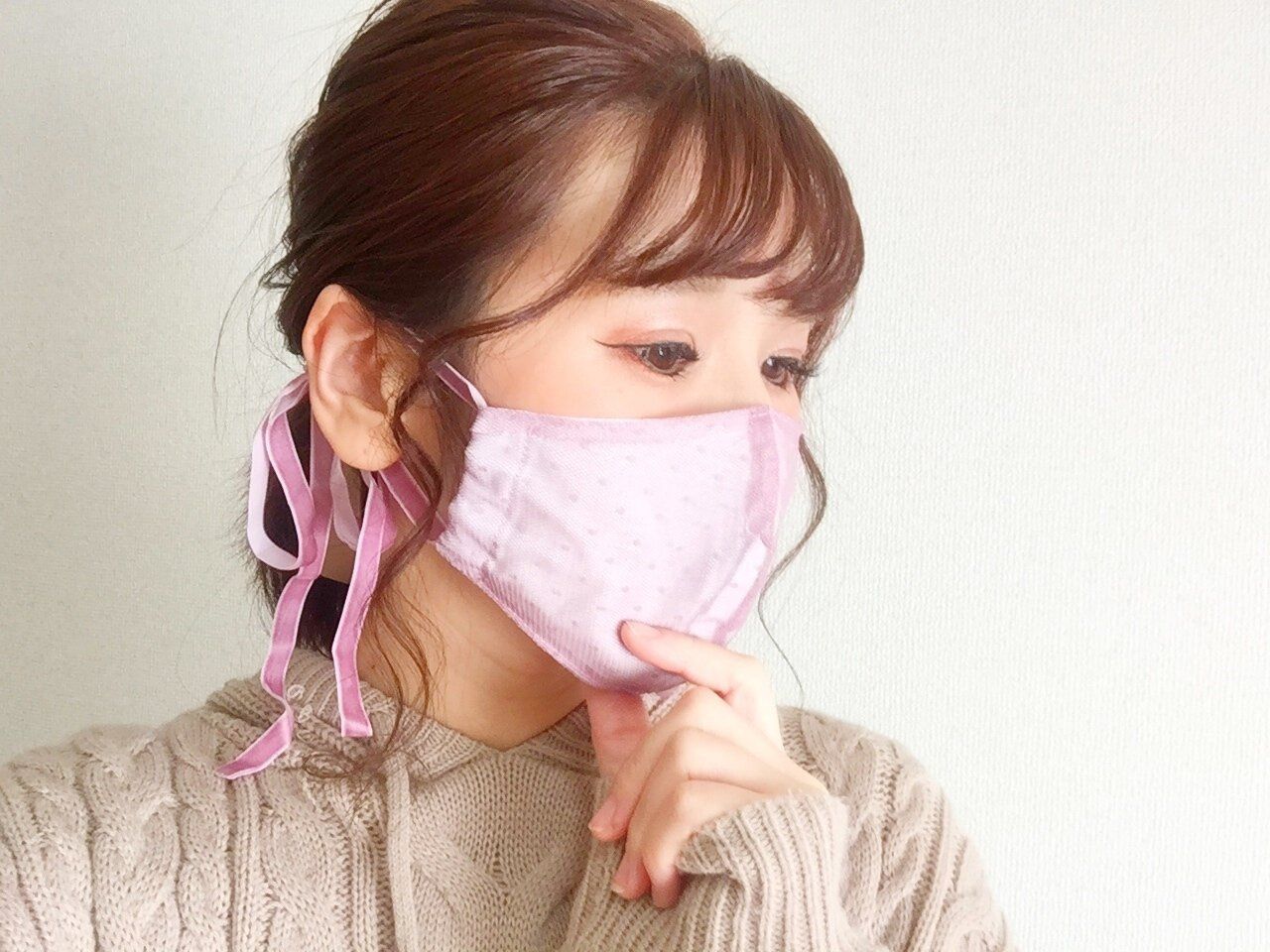このマスクのかわいいポイントは、耳ひものリボンが長めなので、調節して結んだ部分がアクセサリーのようにかわいいところ!