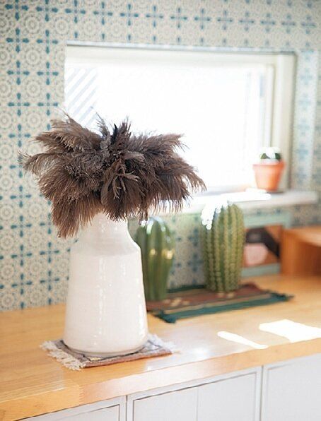 <窓枠や壁の巾木のほこりもすぐ払えるよう、はたきは花びんにスタンバイ>