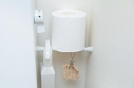 <トイレには収納がないので、ミニ突っ張り棒で工夫>