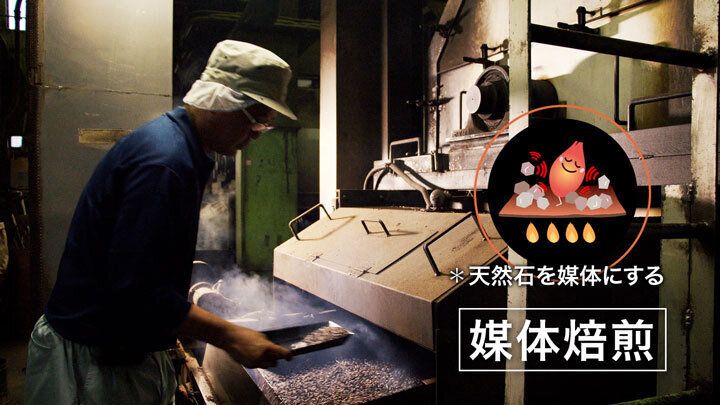 「一般的な麦茶では、熱風焙煎のみを採用していますが、健康ミネラルむぎ茶では香ばしい香りと、甘いコクを引き出すために、熱風焙煎に加えて、媒体焙煎も採用しています。熱風焙煎は、時間をかけて熱風を当てることでやさしい甘さを引き出します。