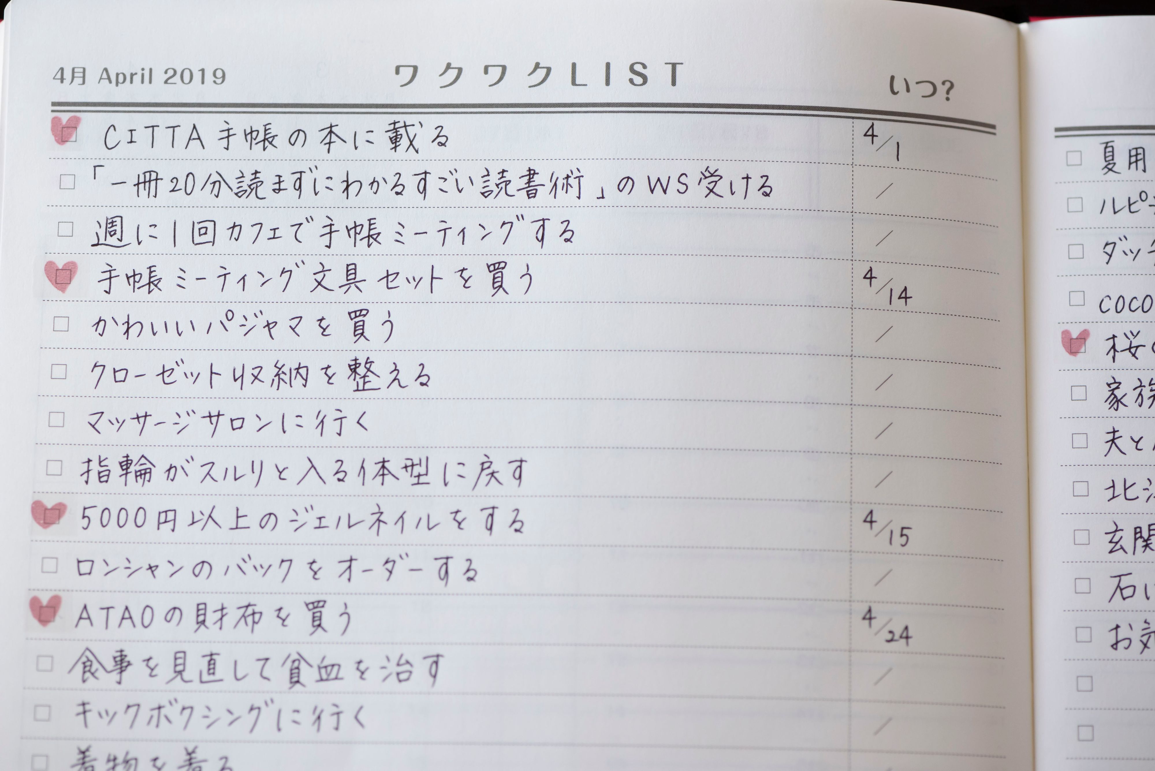 さらにさらに、 夢がかなうだけでなく、CITTA手帳を使い始めてからいくつかよい変化がありました。どんな変化があったかというと、まずは行動力がついたこと。夢や希望をいつまでに実現するか期限を書くことで、「よし、〇〇までにやるゾ!」という気持ちがわき、それがかなうと自信や喜びが生まれ、ほかにもやりたいことがどんどん出てくる。まさに、よきスパイラルです。
