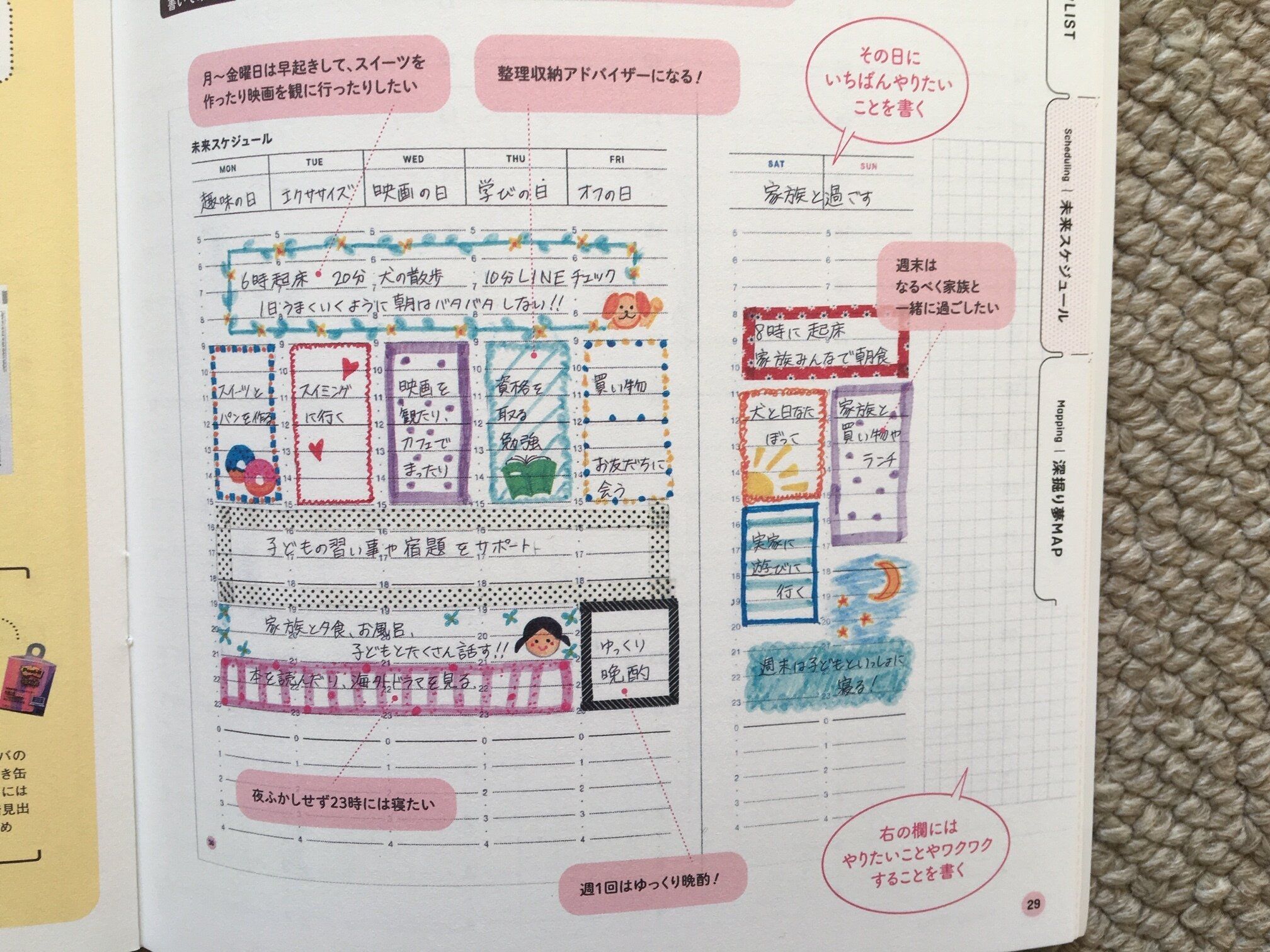 家事や雑事に追われ、いつも時間がないと感じていましたが、「本当は1週間をこんな風に使いたいんだ!」という理想のスケジュールを思う存分書いてみたら、自分のしたいことに割ける時間が増えました。何となくダラダラ過ごしていた時間が減り、自分のために使える時間が増えたようです。
