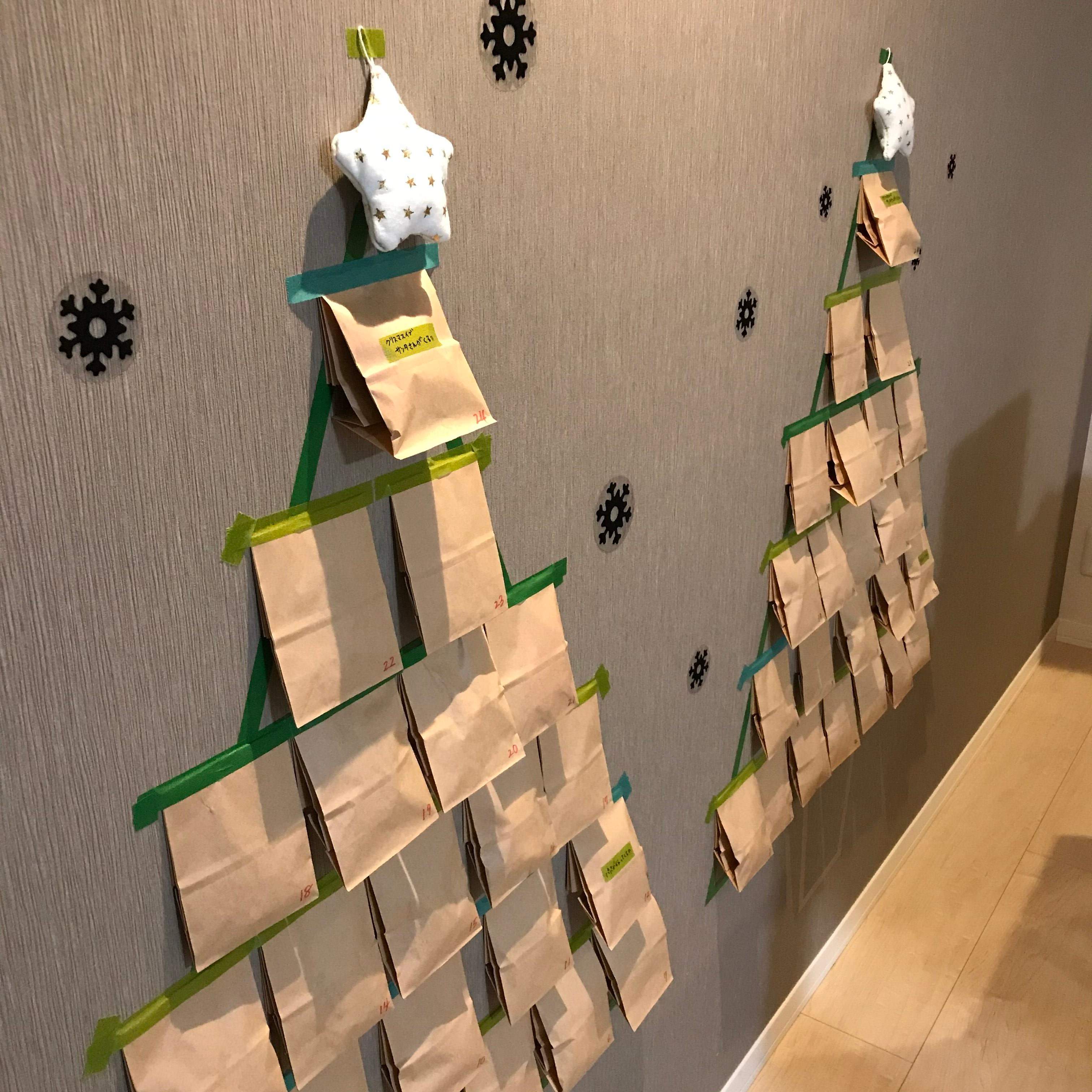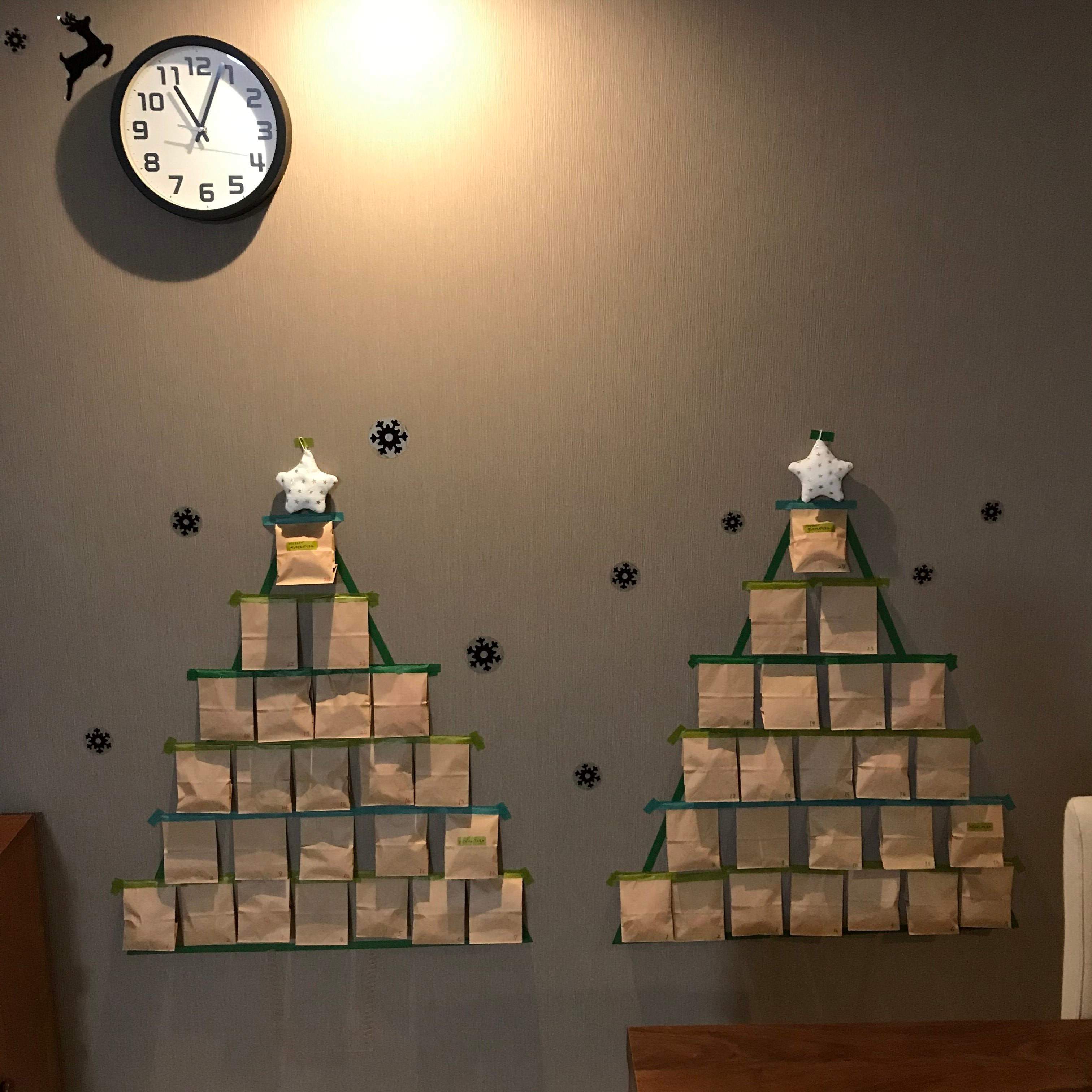 こちらは昨年のわが家のリビングです。壁にマスキングテープを貼っただけのツリー型アドベントカレンダーを100均材料オンリーで手作りしました。
