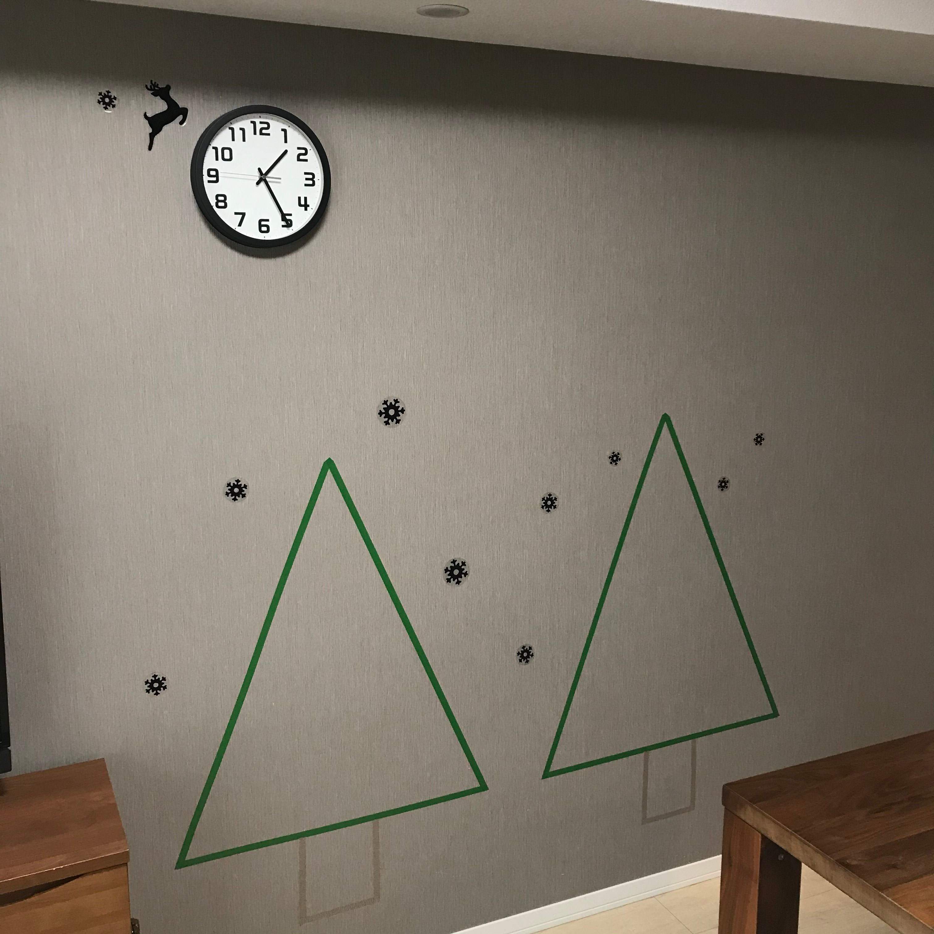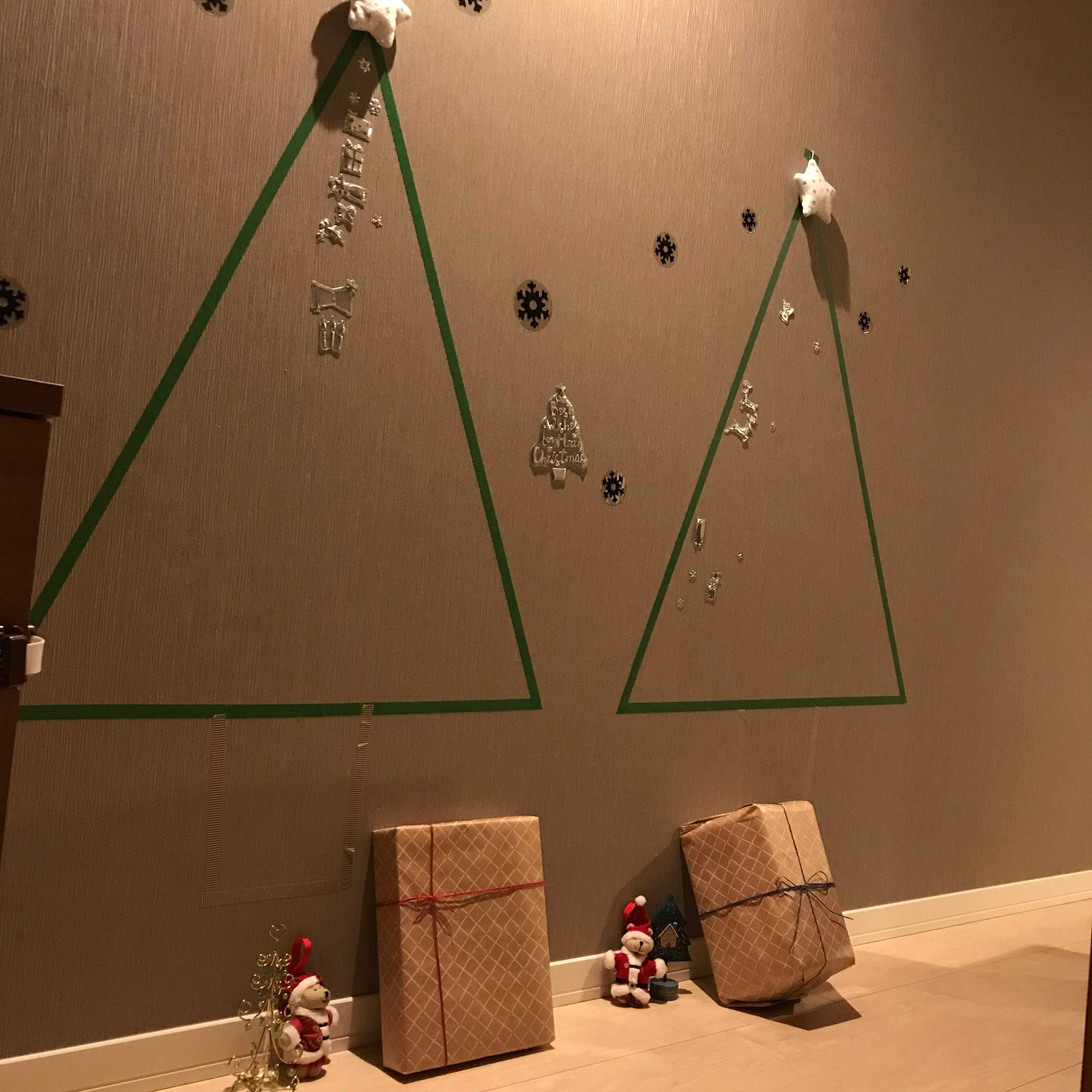 緑色のマスキングテープを使ってツリーのベースをつくり、セリアで買ったウォールステッカーでデコレーションしました。