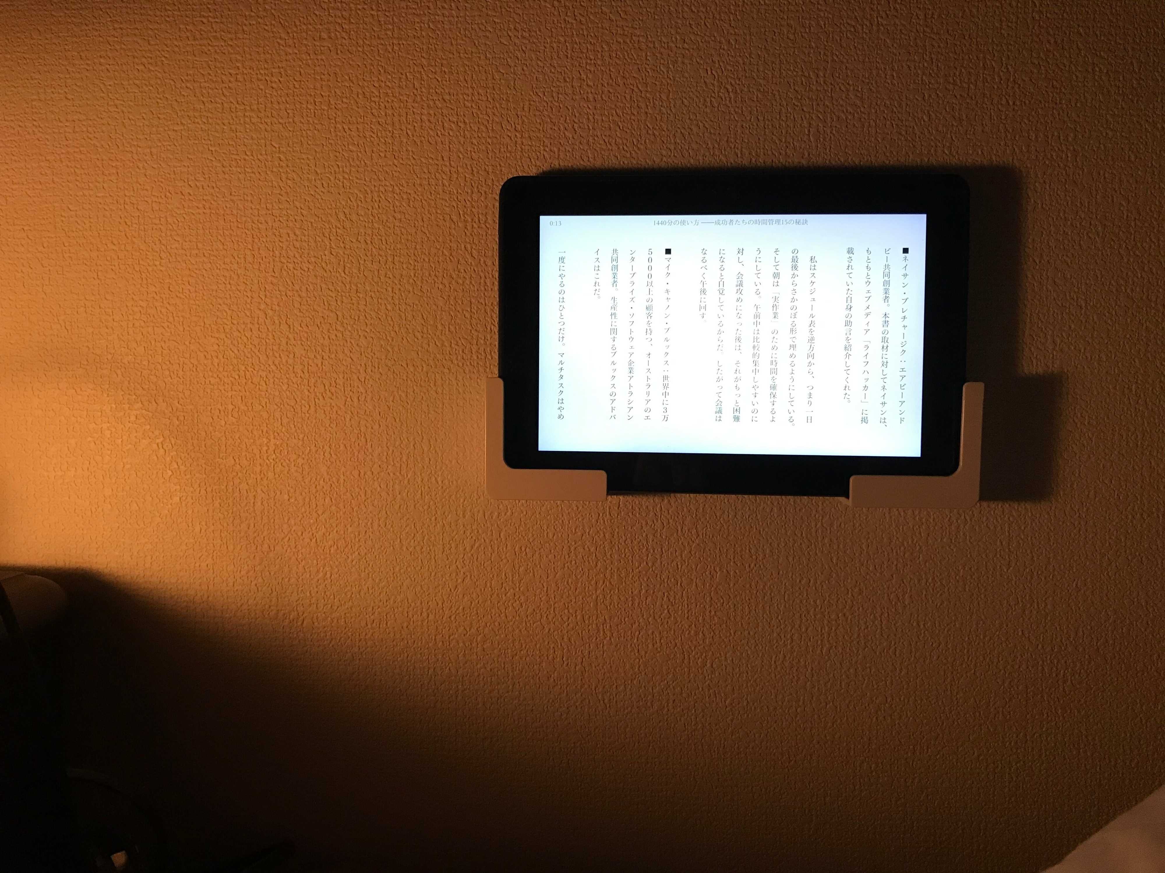 こうすることで、ベッドに横になりながら、指をスライドさせるだけで本を読めるから、タブレットやスマホを持つ手が疲れません。くれぐれも荷重オーバーにならないように気をつけます。
