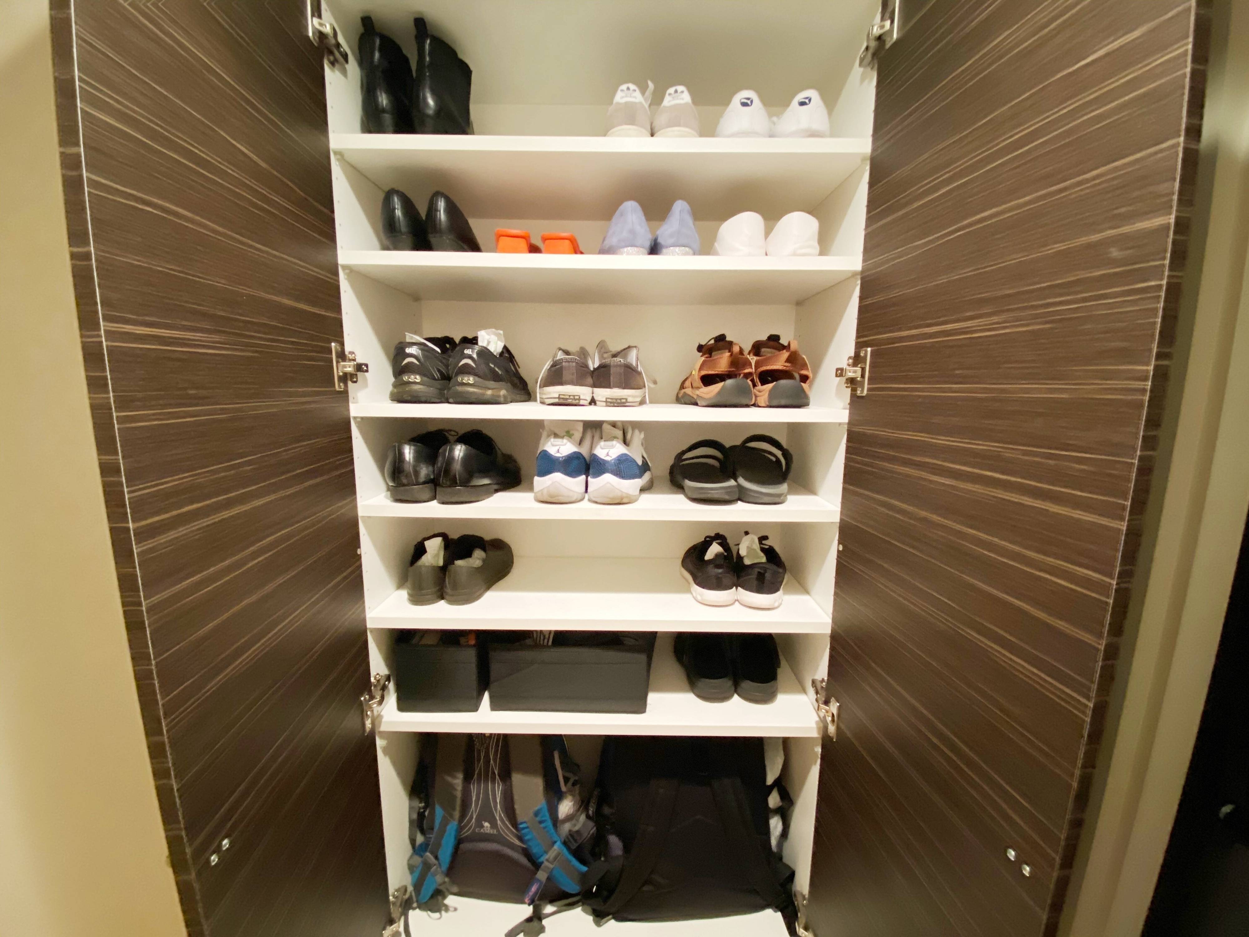 「空間はこれだけだから収納可能数は〇足」と具体的に数字を示す事で納得してもらいやすく、かつ各自のエリアの使いみちは自由なところが、家族にも受け入れられやすいポイントです。