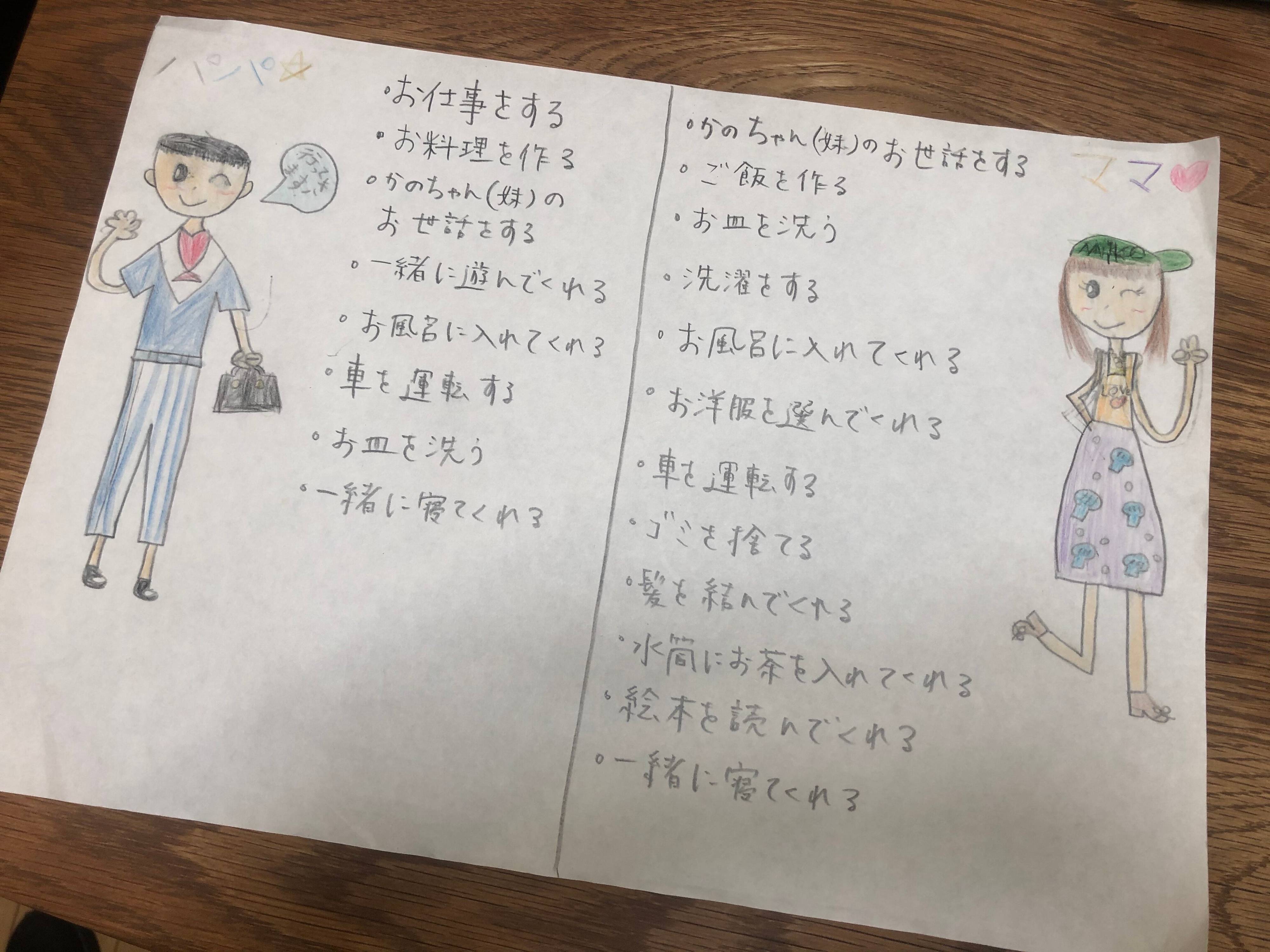 子どもたちには難しかったので、パパとママの役割について子どもたちと考えてみました。