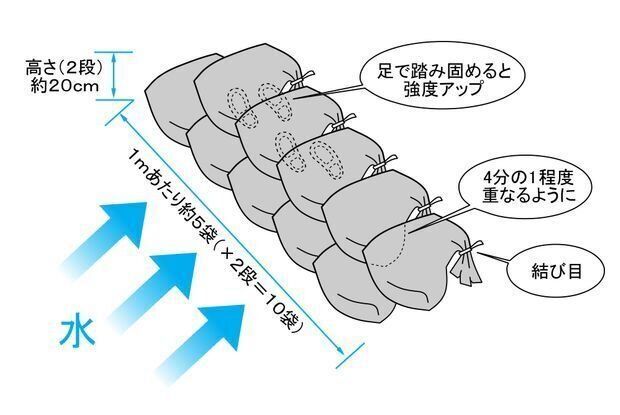 ・隙間をなくすために土嚢を足で踏み固めたり、ブルーシート等で包んだりすると効果的