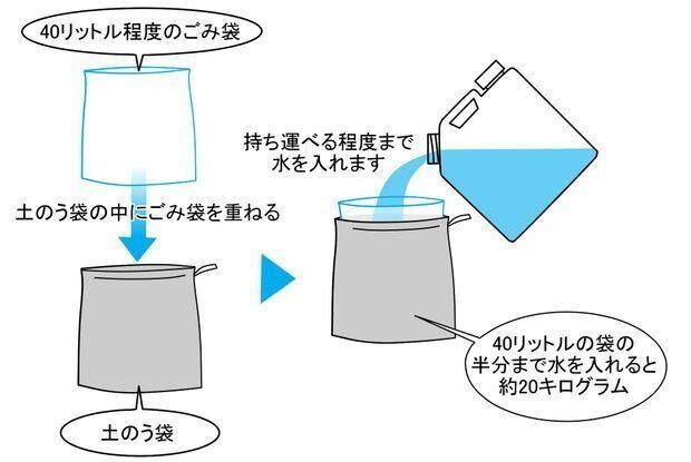 - 1 土嚢袋の中にごみ袋を重ね、自分で持ち運べる程度まで水を入れる
