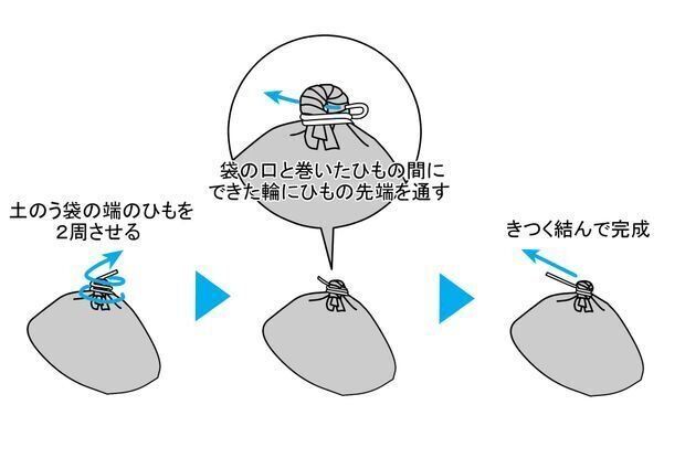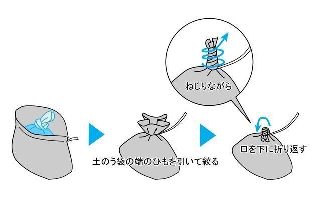 - 3 土嚢袋の端のひもを引いて絞る。ねじりながら口を下に折り返し、ひもを2周させる