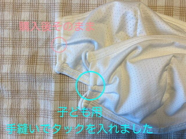 わたしの子ども(小6)は、アジャスターで調節しても頬の辺りに隙間ができてしまったので、手縫いで一段プリーツを寄せるように縫いました。