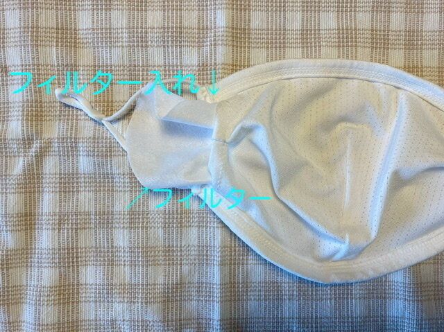 マスク1枚につき、専用フィルターが10枚ついてきます。マスク内側の切れ込みから、マスクフィルターが入れます。若干入れにくいのが……惜しい。切れ目は左右にあるので、片方からフィルターを差し込み、指で押さえたまま、反対側からも指を入れて左右に引っ張るといいんじゃないかと思います。