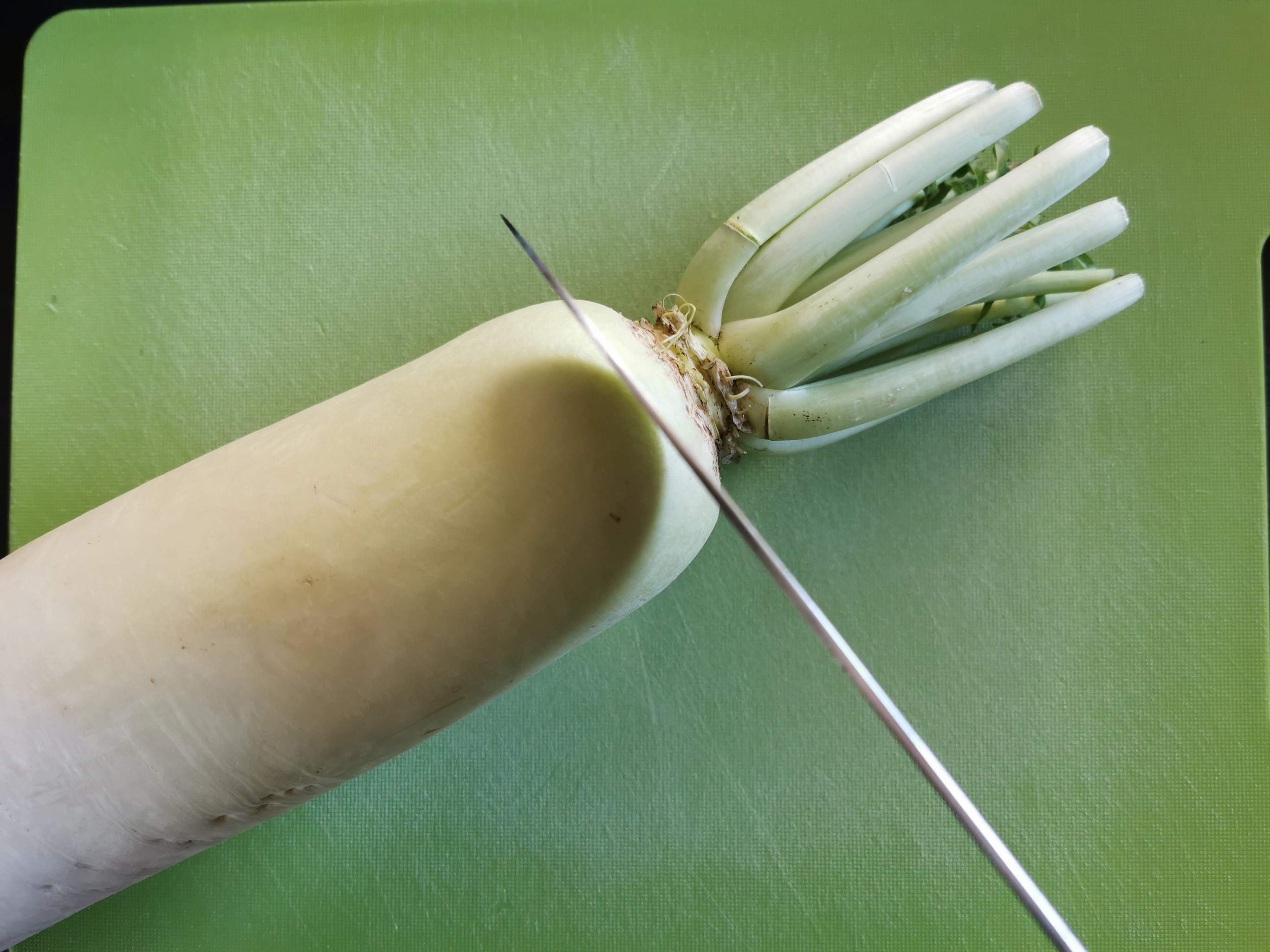 (1)大根の葉がついている上の部分を切り落とす。
