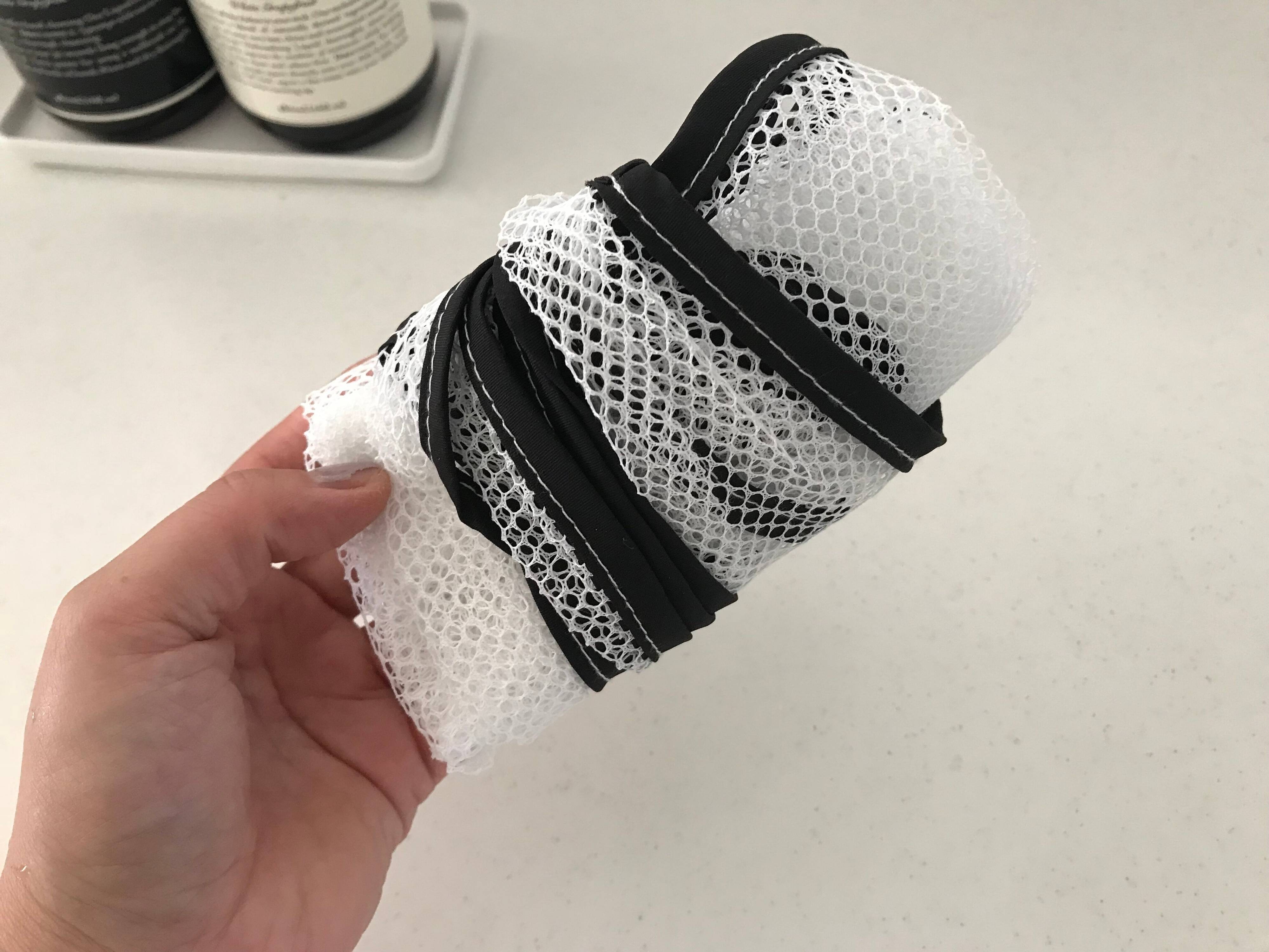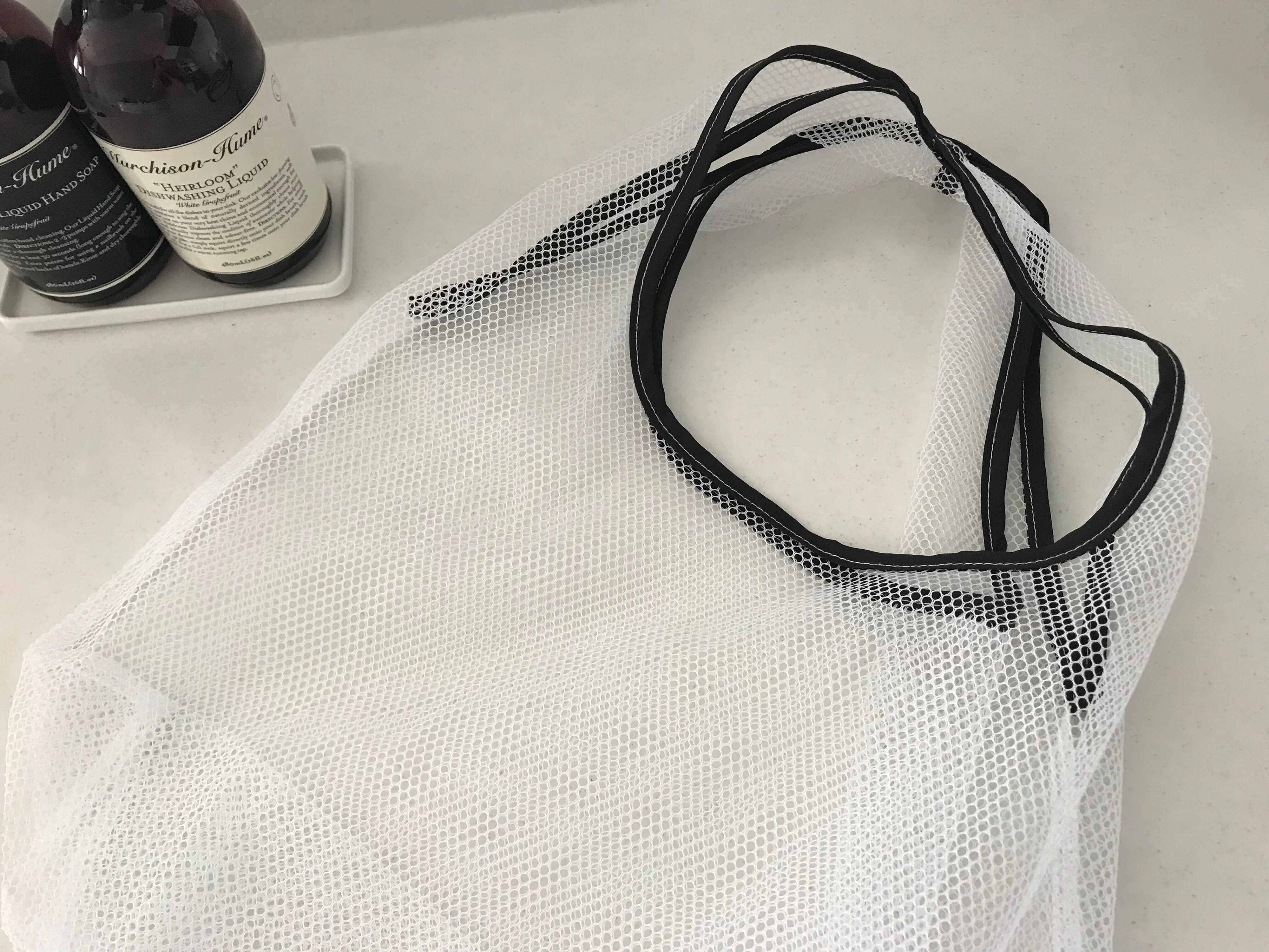 こちらはダイソーで購入したメッシュバッグです。涼しげなメッシュ素材にブラックとホワイトのモノトーンカラーがかわいいですよね。