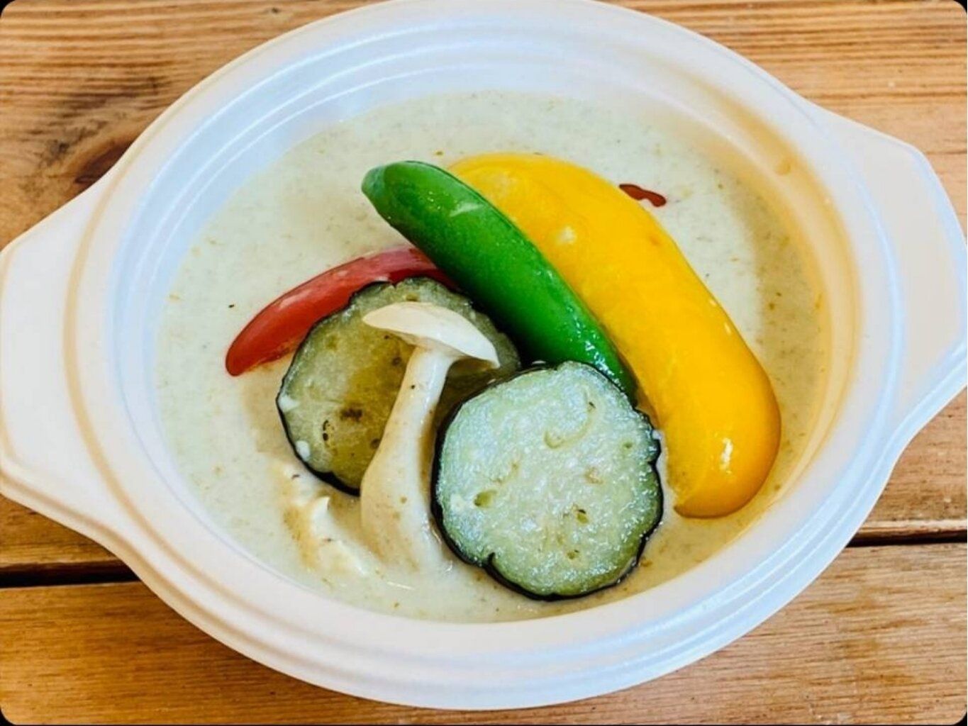 ベジタリアン&ヴィーガン食に力を入れているカフェのグリーンカレー。動物性食材不使用とは思えないおいしさ。量が少ないように見えますがお豆腐が入っていて食べ応えも◎