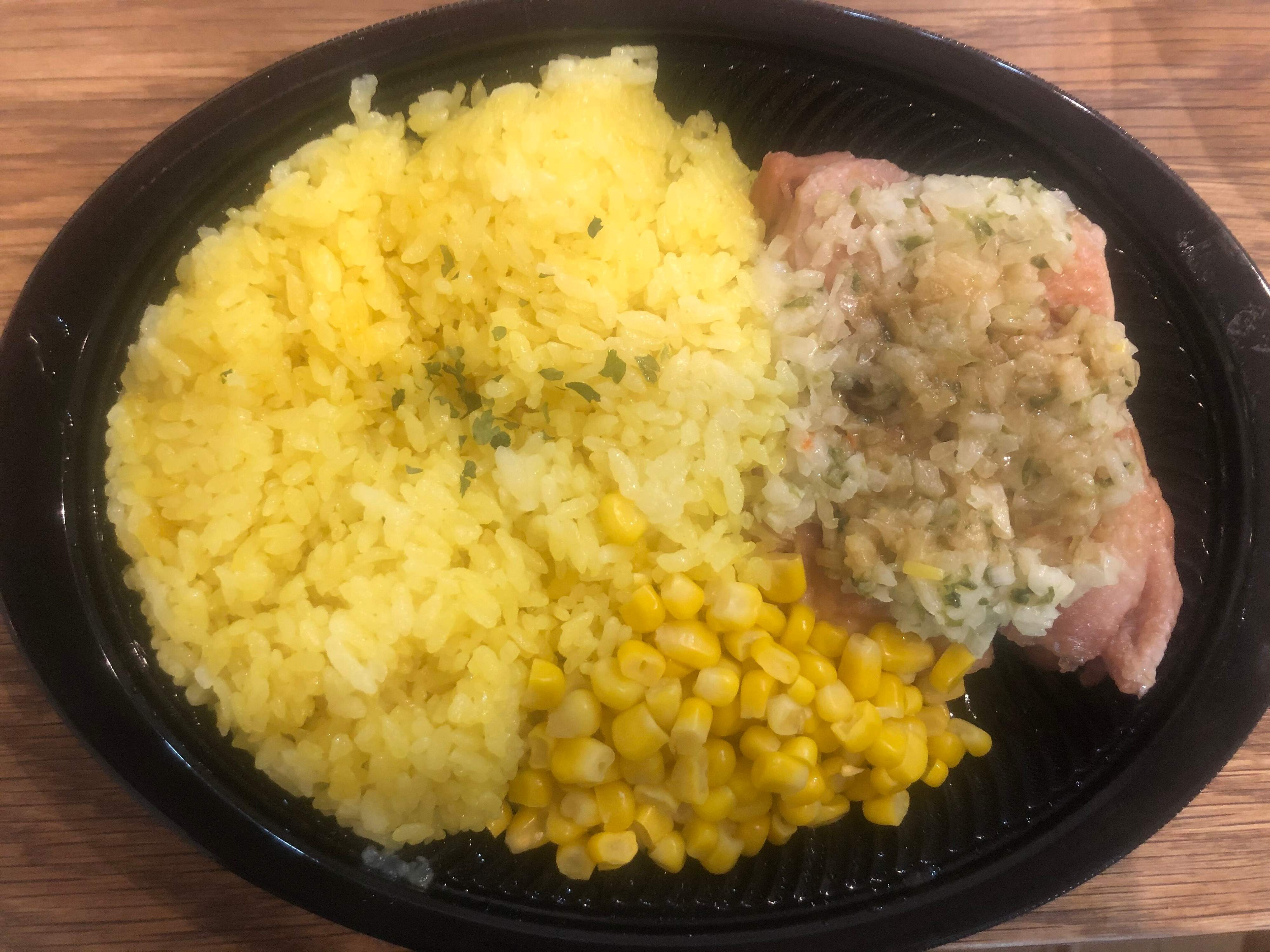 店内では「ハヤシ&ターメリックライス」で食べることのできるあの黄色いターメリックライスがたっぷり〜。コーンもどっさり入っていました。