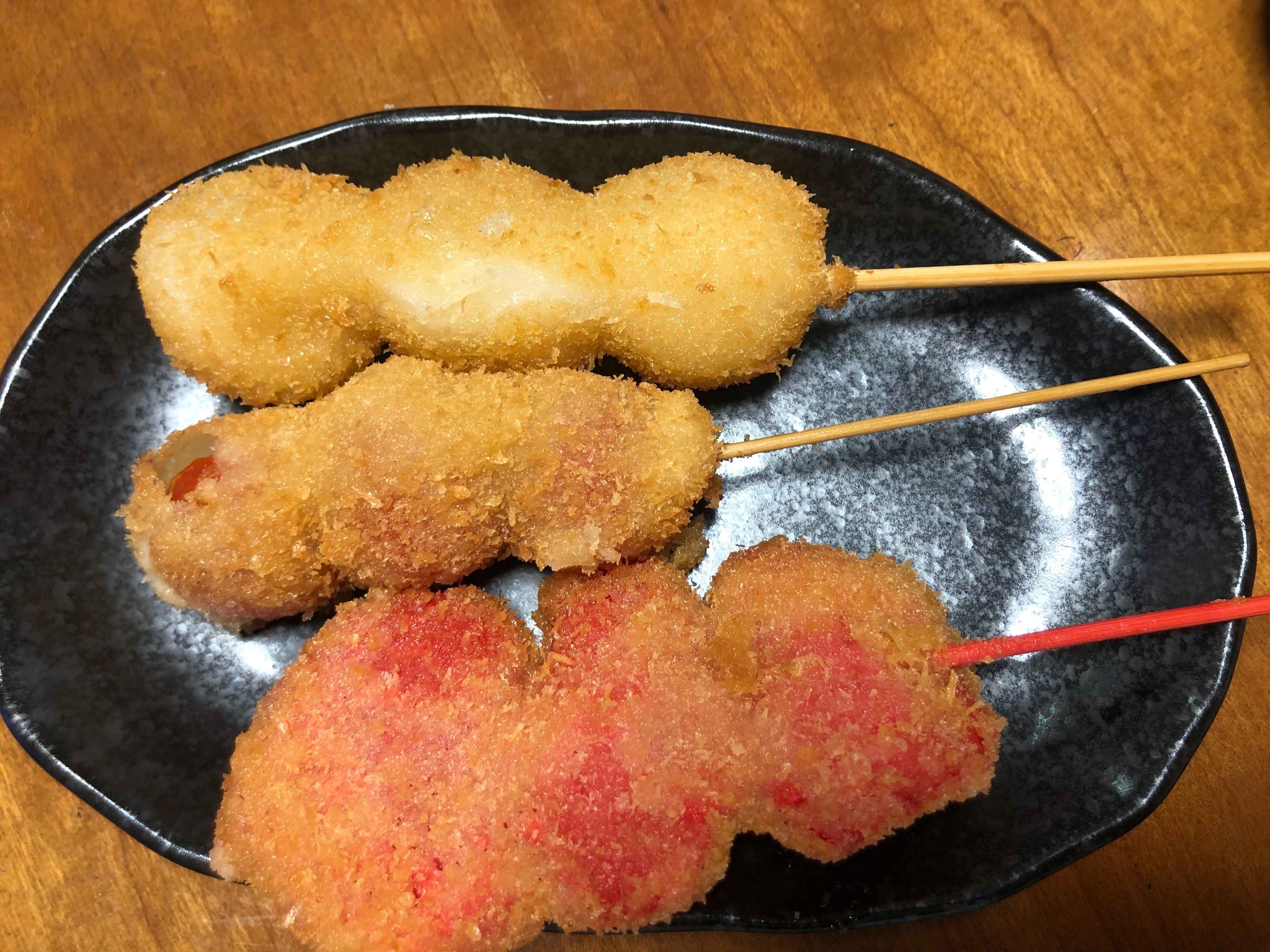 現在「コロナにカツセット」がお得品として販売されています。「エビ・レンコン・牛・豚・紅しょうが・うずら」の6本セット、単品合計780円が567円です。