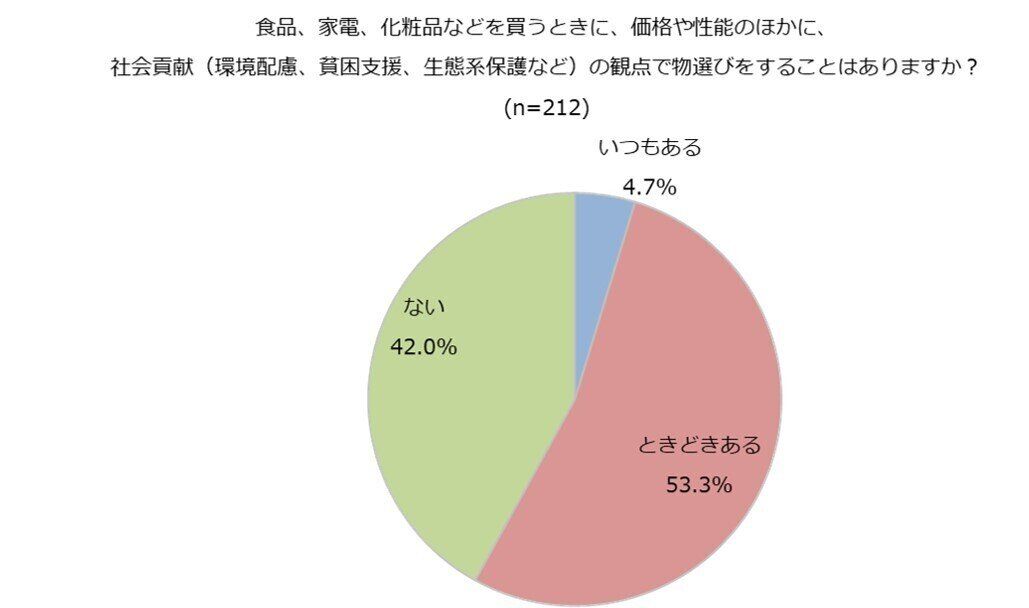 まず今現在、食品、家電、化粧品などを買うときに、価格や機能性のほかに、社会貢献(環境配慮、貧困支援、生態系保護など)の観点でもの選びをすることがあるか聞いたところ、53.3%の人が「ときどきある」、4.7%の人が「いつもある」と回答し、合わせると58%になりました。