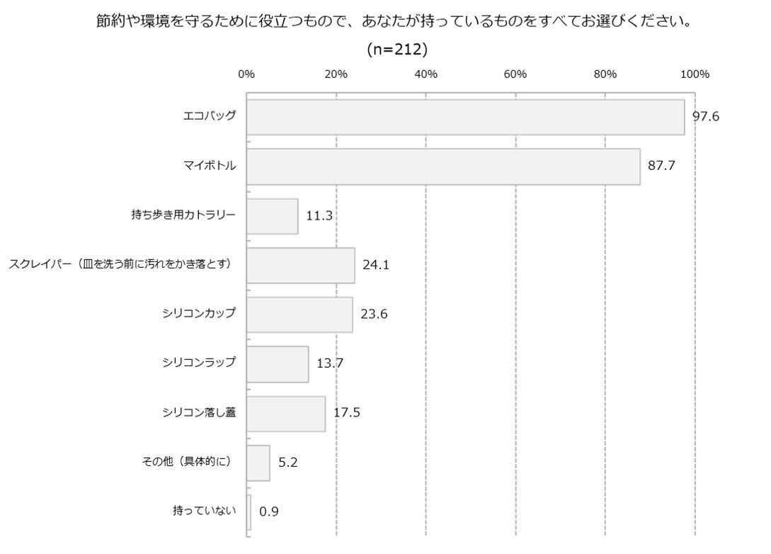 節約や環境を守るために役立つもので、持っているものをすべて選んでもらったところ、ほぼ全員が「エコバッグ」と「マイボトル」を持っていることがわかりました。次に多かったのはスクレイパーの24.1%と、シリコンカップの23.6%でした。