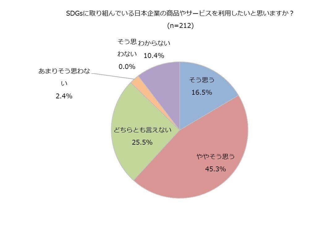 「SDGs」の17個の目標のなかには「飢餓をゼロに」、「エネルギーをみんなに そしてクリーンに」、「海の豊かさを守ろう」といったものがあるのですが、こうした「SDGs」に取り組んでいる日本の企業の商品やサービスを利用したいと思っているか?聞いてみると、16.5%が「そう思う」、45.3%が「ややそう思う」と回答し、合計すると61.8%になりました。